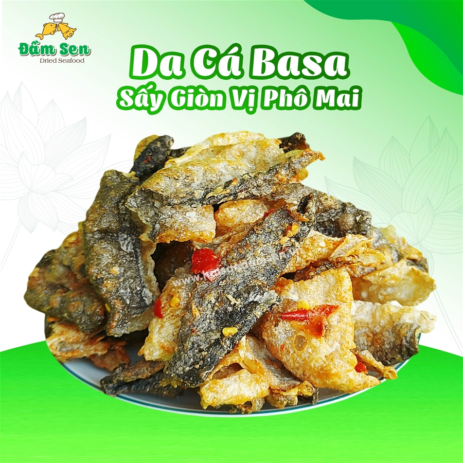 Thành phần: 90% da cá vị nguyên bản, 9% gia vị (đường, muối, chất điều vị mononatri L-glutamat 621, tỏi, ớt), 1% phô mai
